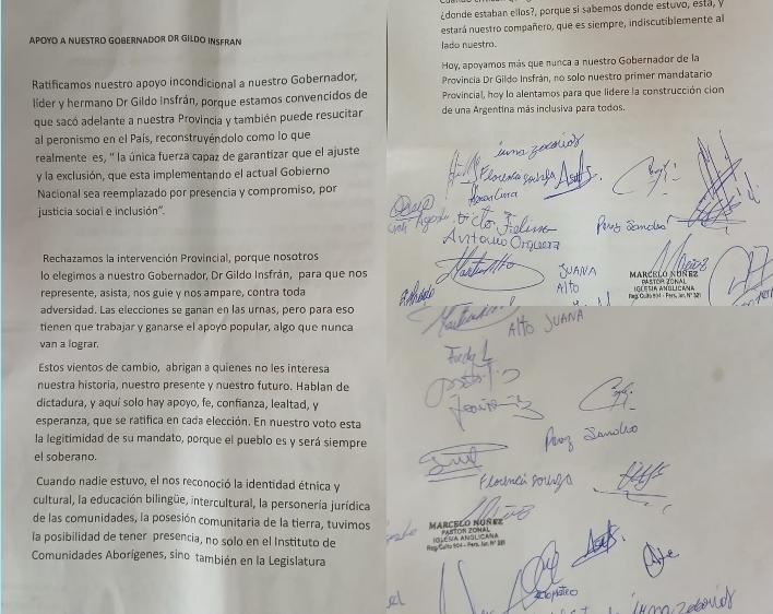 “Incondicionalmente respaldamos a nuestro líder y hermano Dr Gildo Insfrán, porque estamos convencidos de que sacó adelante a nuestra Provincia y también puede resucitar al peronismo en el País, reconstruyéndolo como lo que realmente es, la única fuerza capaz de garantizar que el ajuste y la exclusión, que esta implementando el actual Gobierno Nacional sea reemplazado por presencia y compromiso, por justicia social e inclusión”, dice en el primer párrafo.