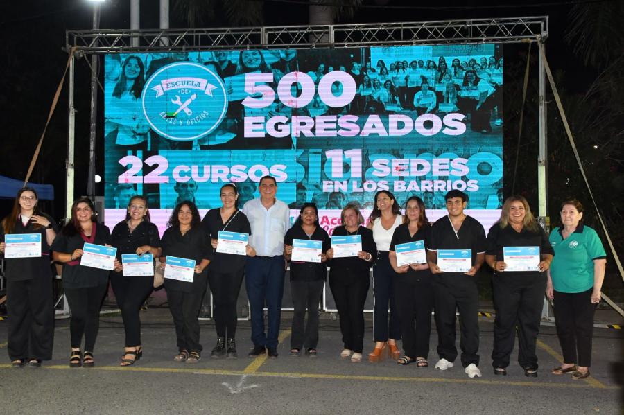 En la tarde del sábado, en el playón municipal, el intendente Jorge Jofré hizo entrega de diplomas de certificación de formación teórico-práctica a más de 500 egresados de la Escuela de Artes y Oficios de la Municipalidad, dependiente de la Secretaría de Acción Social, que en esta segunda cohorte del 2025 ofreció 22 cursos, sumando un total de 6.000 alumnos que finalizaron la Escuela desde su creación.