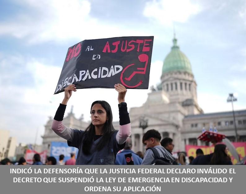 La norma había quedado suspendida por un Decreto del Ejecutivo Nacional hasta tanto el Congreso especificara de dónde saldrían los fondos. Con este fallo se declara “la invalidez del Art. 2 del Decreto Nº 681/2025, publicado el 22 de septiembre de 2025 en el Boletín Oficial de la República Argentina y en consecuencia, se ordena la inmediata aplicación de la Ley 27.793 (Emergencia Nacional en Discapacidad)”. El fallo señala: "Reafirmando que el derecho a la salud, educación y rehabilitación de personas con discapacidad debe prevalecer frente a restricciones presupuestarias y que el Estado Argentino está obligado a cumplir con los estándares constitucionales e internacionales que garantizan la protección integral de los grupos más vulnerables y la obligación de no regresividad establecida en la Convención Americana sobre Derechos Humanos, corresponde declarar la invalidez del Art. 2° del Decreto 681/2025". Además, la Justicia recalcó que "el 10 de julio de 2025 el Honorable Congreso de la Nación sancionó la Ley 27.793 por la que se declaró la emergencia en discapacidad en todo el territorio nacional hasta el 31 de diciembre de 2027, con el objetivo de garantizar el cumplimiento efectivo de los derechos de las personas con discapacidad". El Ombudsman Provincial, Dr. José Leonardo Gialluca, denunció que, el Sistema de Prestaciones Básicas de Atención Integral a favor de las Personas con Discapacidad "atraviesa una crisis sistémica caracterizada por el desfinanciamiento progresivo, el colapso de las prestaciones reflejado en el cierre masivo de instituciones, interrupción de tratamientos y deterioro crítico de la calidad de servicios". La suspensión de la ley, expresa el fallo, impide la aplicación de las medidas "diseñadas para garantizar la continuidad de las prestaciones, establecer estándares mínimos de calidad y accesibilidad, implementar mecanismos de monitoreo y evaluación del sistema y asegurar la participación efectiva de las personas con discapacidad en las decisiones que las afectan". El citado devuelve las pensiones por invalidez y la continuidad de tratamientos interrumpidos, un hecho calificado como "una gran noticia" por parte del colectivo de personas con discapacidad; ello sucede ante la procedencia de la Acción Judicial caratulada: "J.O.G. (en representación de sus hijos) y otro c/ ESTADO NACIONAL/PRESIDENCIA DE LA NACION s/ AMPARO COLECTIVO", del Juzgado Federal de Primera Instancia de Campana, Resolución firmada por el Juez Adrián González Charvay. De esta manera, el Decreto ahora anulado por la Justicia había sido el “artilugio” que encontró el Gobierno Nacional para promulgar la ley sancionada por ambas Cámaras del Congreso, pero suspender su ejecución hasta que se "determinen las fuentes específicas para su financiamiento".