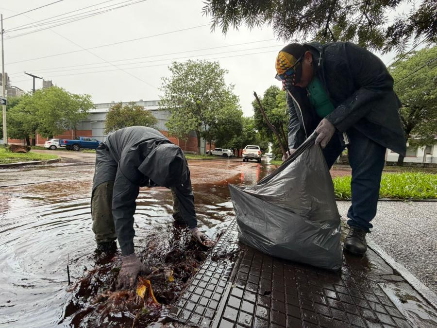 Cuadrillas del Comando de Emergencia municipal trabajaron rápidamente ante las primeras caídas de agua en la mañana del lunes, las que se emplazaron en los puntos más vulnerables de la ciudad, distribuida en distintos equipos de operarios y cooperativistas, con el objetivo de evitar grandes anegaciones a causa que se produjeran por la obstaculización de desagües.